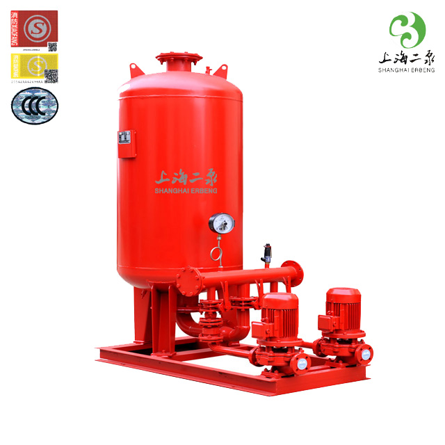 本設備由隔膜式氣壓罐、水泵、遠傳壓力表、閥門、管道及電控柜等組成。是消防給水系統理想的消防增壓穩壓設備,它能使消防管道系統始終保持不利點消火栓及自動噴水所需的壓力,而且能使壓氣罐始終貯有所要求壓力的消防水量,一旦發生火災,確保消火栓等消防設備可以立即投入撲救。