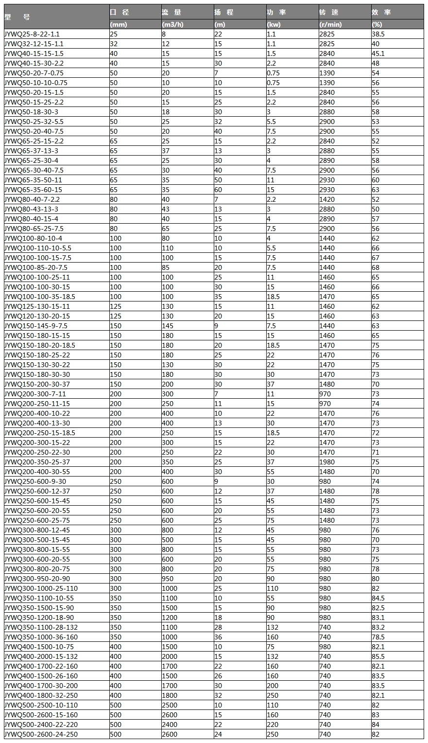 | | | | |__ 電機(jī)功率:KW | | | |_________ 額定揚(yáng)程H:M | | |_______________ 額定流量Q:M3/H | |_____________________ 出水口徑直徑MM |_____________________________ 攪勻式無堵塞潛水排污泵