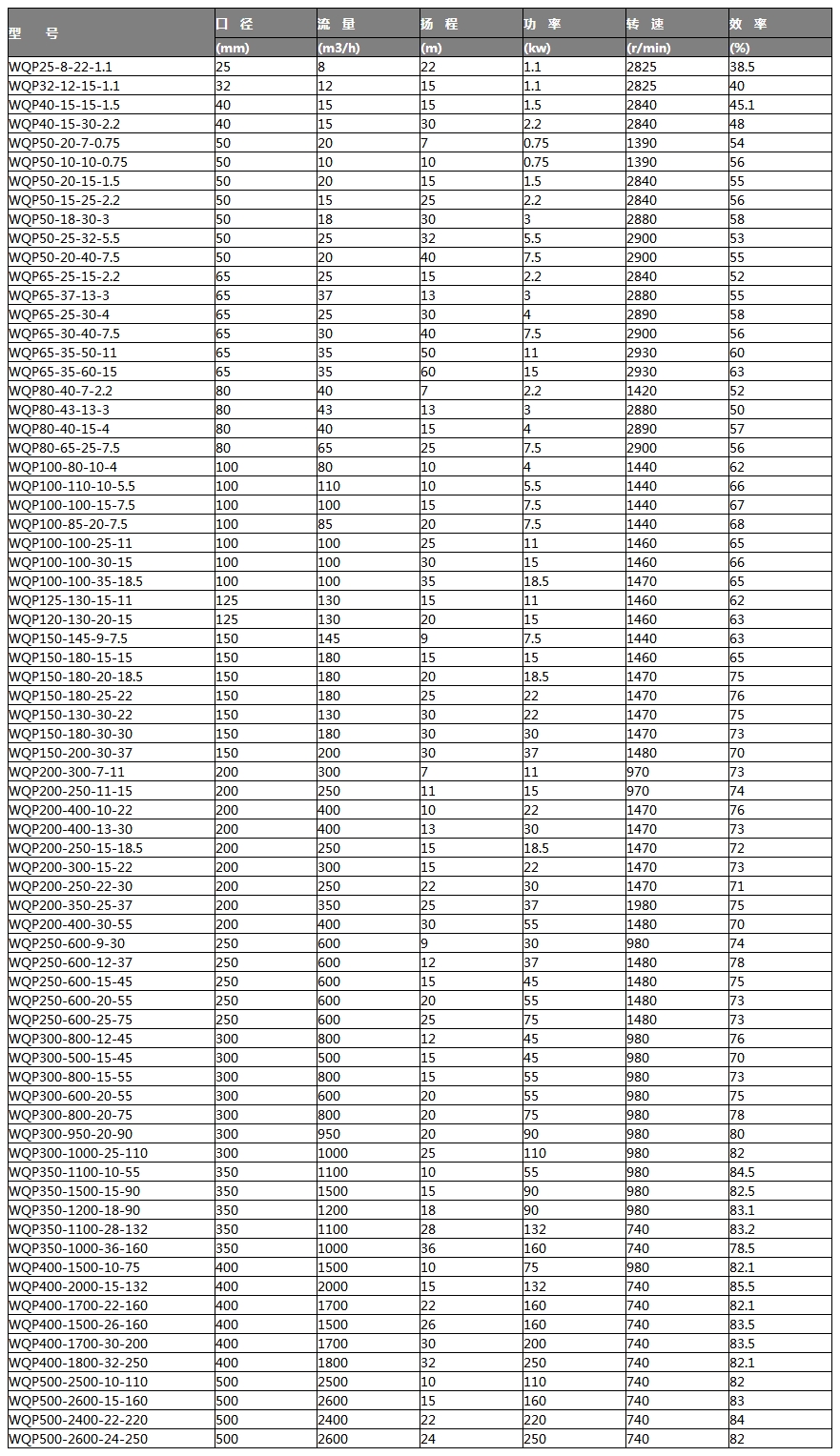WQP 50 - 20 - 15 - 1.5 | | | | |__ 電機功率:KW | | | |_________ 額定揚程H:M | | |_______________ 額定流量Q:M3/H | |_____________________ 出水口徑直徑MM |__________________________ 不銹鋼無堵塞潛水排污泵
