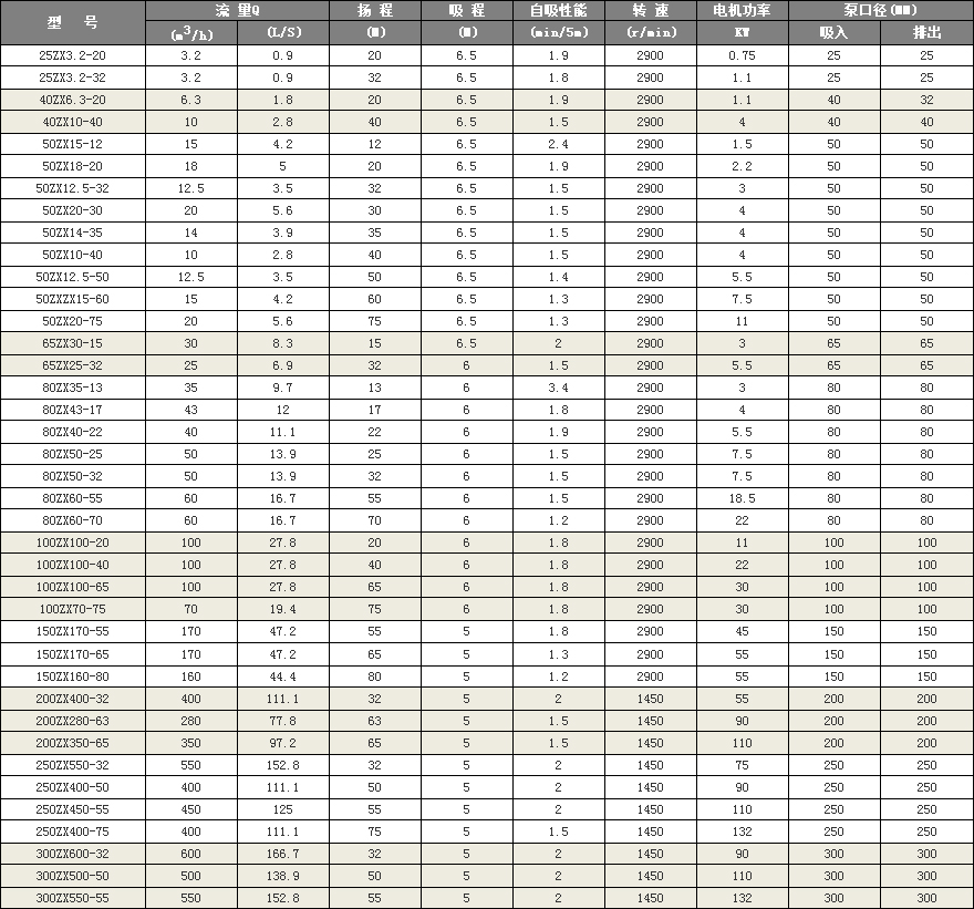 上海二泵ZX系列型泵是臥式自吸離心泵。該型式泵 與其它型式的自吸離心泵比較,因為泵本身沒有逆止閥,結構為簡單;工作為可靠;無 故障工作時間長,維護、使用方便、體積小、 重量輕、效率高、在設計上做了特別的考慮與 相同口徑的泵比較,排量大、性能高。
