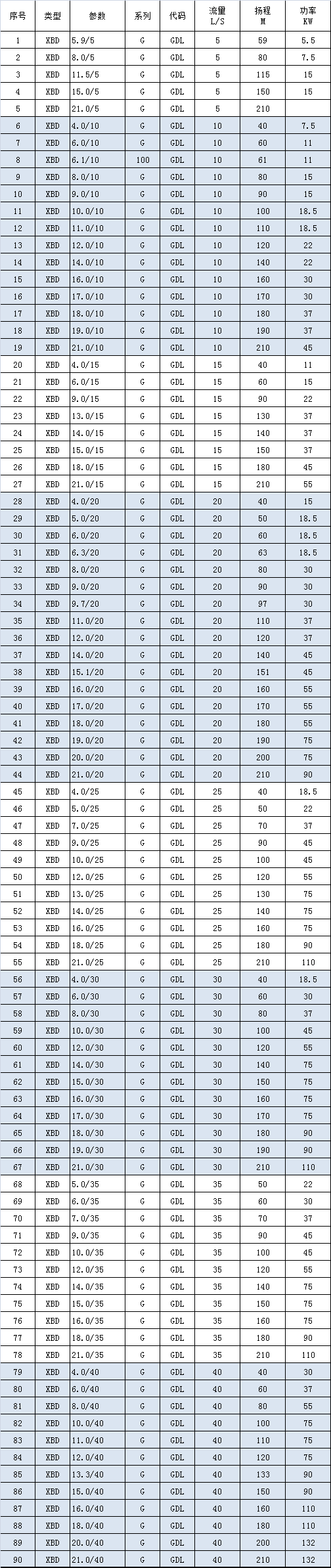XBD-GDL系列立式管道消防泵性能范圍: